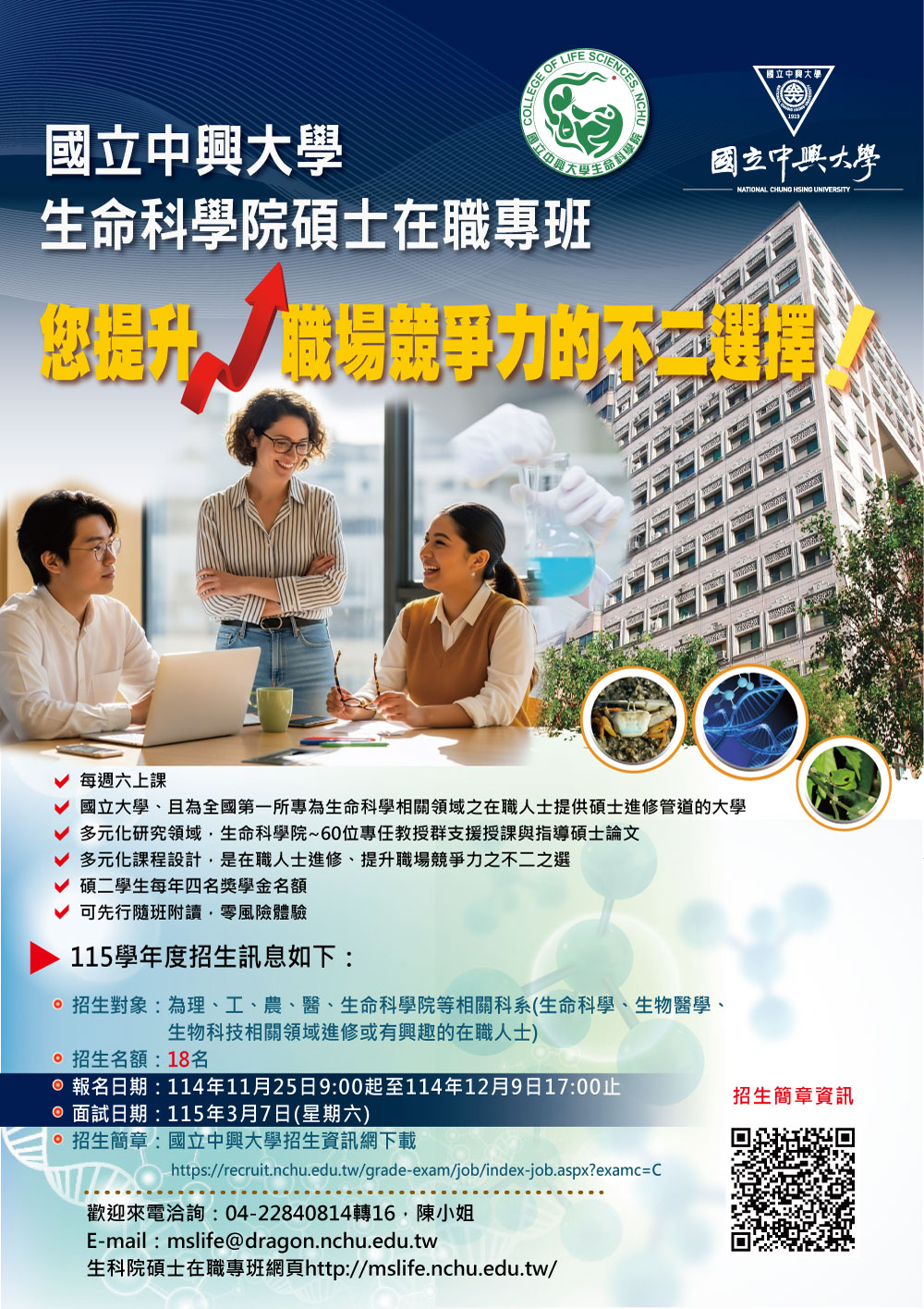 招生對象: 理、工、農、醫、生命科學院等相關科系(生命科學、生物醫學、生物科技相關領域進修或有興趣的在職人士